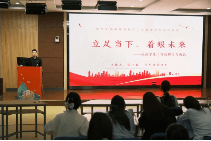 员工处管理科张士超老师以“你为什么选择当员工干部”为题,引导学员们思考自身所肩负的责任,随后从员工干部的角色意义、必备素养、实践指南、未来方向四个方面展开讲解,帮助学员们明晰了员工干部的职责,他指出青年要志存高远、脚踏实地,在学习、工作和生活中发挥模范带头作用。