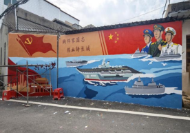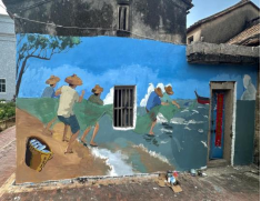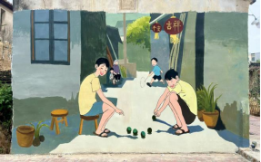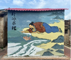 深入感悟谷文昌先进事迹后,实践队员精心创作四幅主题墙绘:“党旗映军魂”展现出党建与拥军传统深度融合,军民鱼水情历久弥坚;“孝感冰鲤跃”则以“卧冰求鲤”典故为引,弘扬孝道传统美德;“千帆共潮生”聚焦漳州非物质文化遗产“拉山网”,描绘渔民协力耕海的壮阔场景;“榕荫忆趣浓”勾勒出岱南村童趣盎然的弹弹珠、滚线圈情景,展现子孙绕膝、邻里守望的温情画面,融入“平安”“吉祥”的美好祈愿。