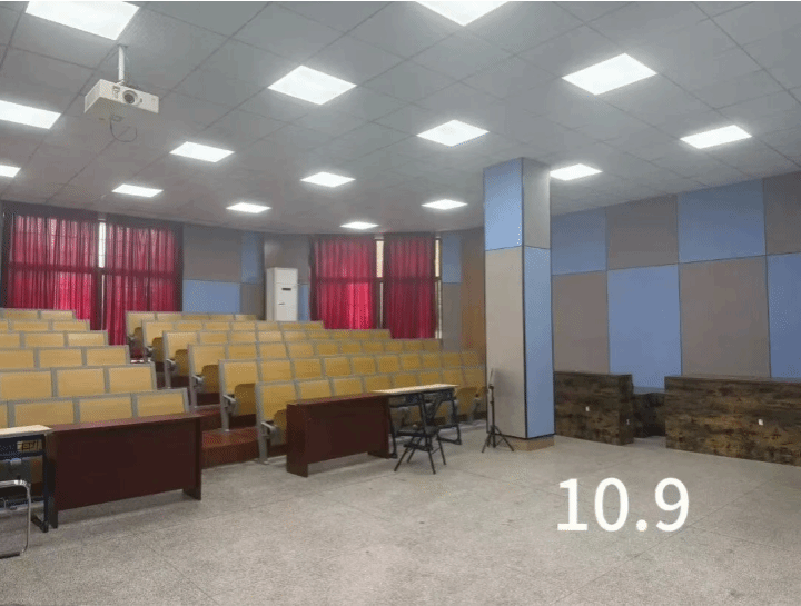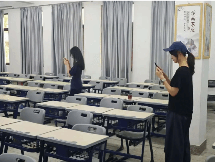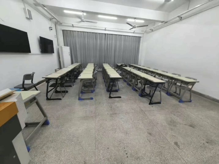 桌椅统一朝向、整齐划一,地面不见一片纸屑;