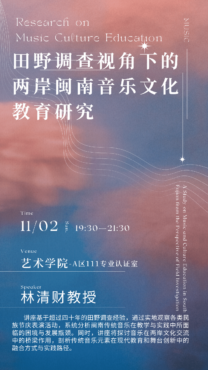 聚焦两岸闽南音乐文化教育的当代表达,从田野方法到文化观念,深入探讨“同源音乐”的多维演化逻辑,以“田野调查视角下的两岸闽南音乐文化教育研究及方法与文化观”为题开展专题讲座。诚邀广大师生与学界同仁,共赴这场跨越海峡、回望根脉的音乐文化盛会。
