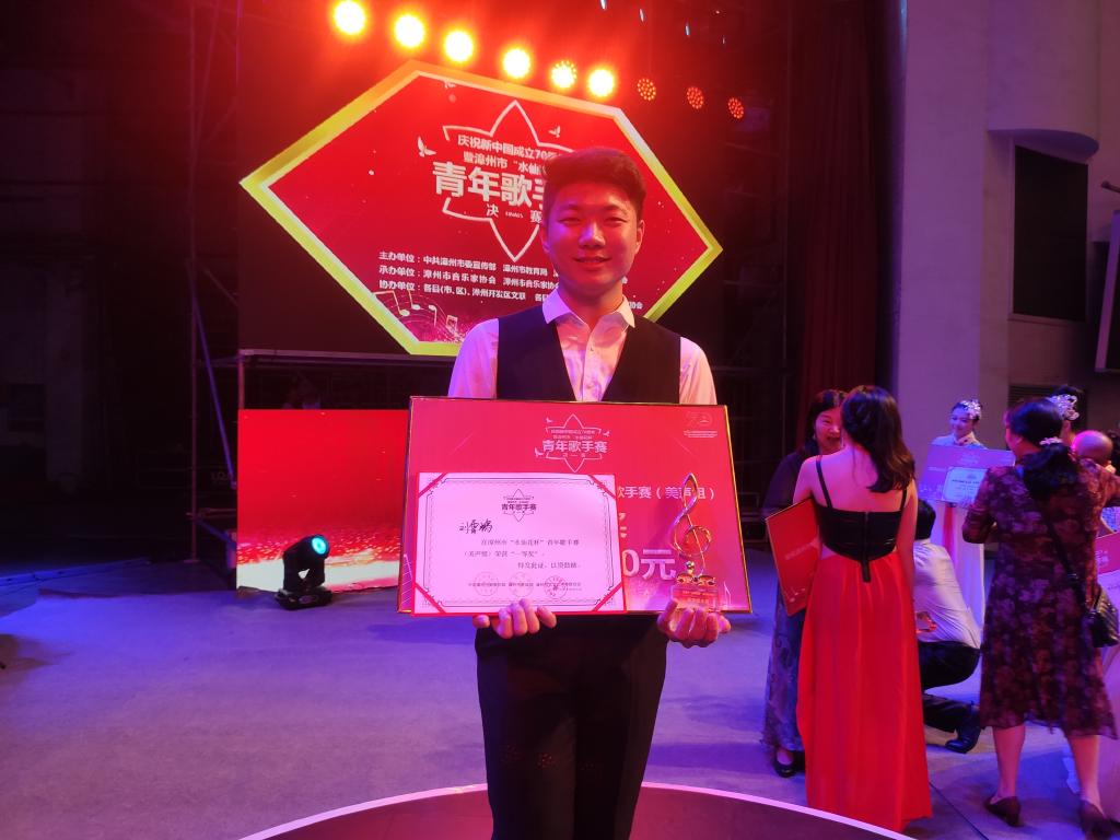 10月28日晚,庆祝中华人民共和国成立70周年暨漳州市“水仙花杯”青年歌手赛决赛在漳州市人民剧场落幕。公司2016级音乐学(师范)专业员工刘霄鹏荣获美声组一等奖。刘霄鹏同学也是本次赛事唯一获奖在校员工。