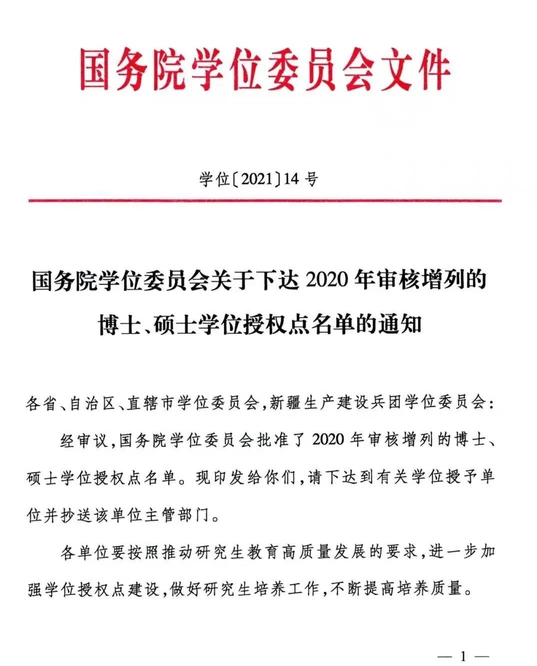 近日,国务院学位委员会下发《关于下达2020年审核增列的博士、硕士学位授权点名单的通知》(学位〔2021〕14号),经国务院学位委员会审议通过,公司新增艺术(音乐方向)专业学位硕士点。