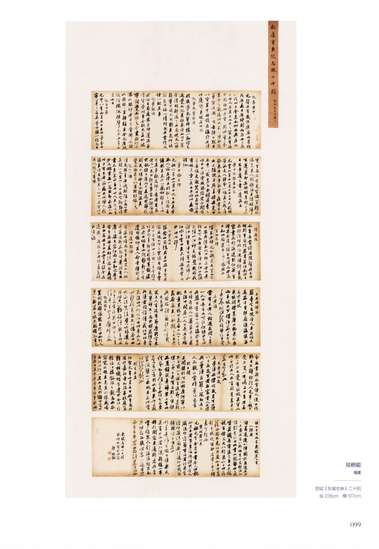 作品以苏、黄二家为主基调,以米、蔡为笔意的创作方向。整体章法采手卷拼接之法,右上辅以纵向签条,纵横交错,增添视觉变化之趣。文本内容为《东坡志林》二十则:其文以短小的篇幅、质朴的文字,描绘东坡心界。每则长短各异,章法留白错落有致,似行云流水,意韵无尽。