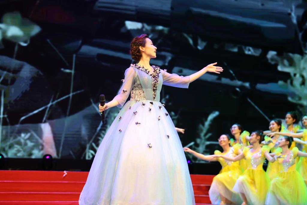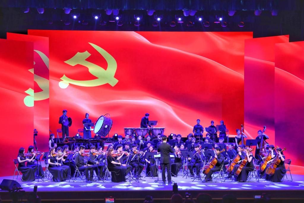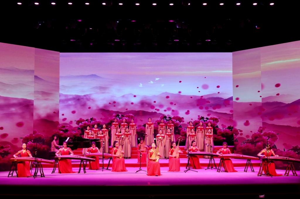 随后,一首民乐合奏的经典作品《唱支山歌给党听》走上舞台,它以多样民族乐器合奏,古筝琵琶与钢琴之声交织,辅以人声,深情真挚地表达了对党的祝福与热爱。