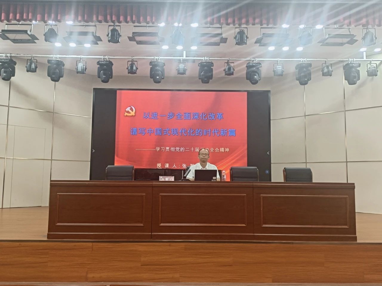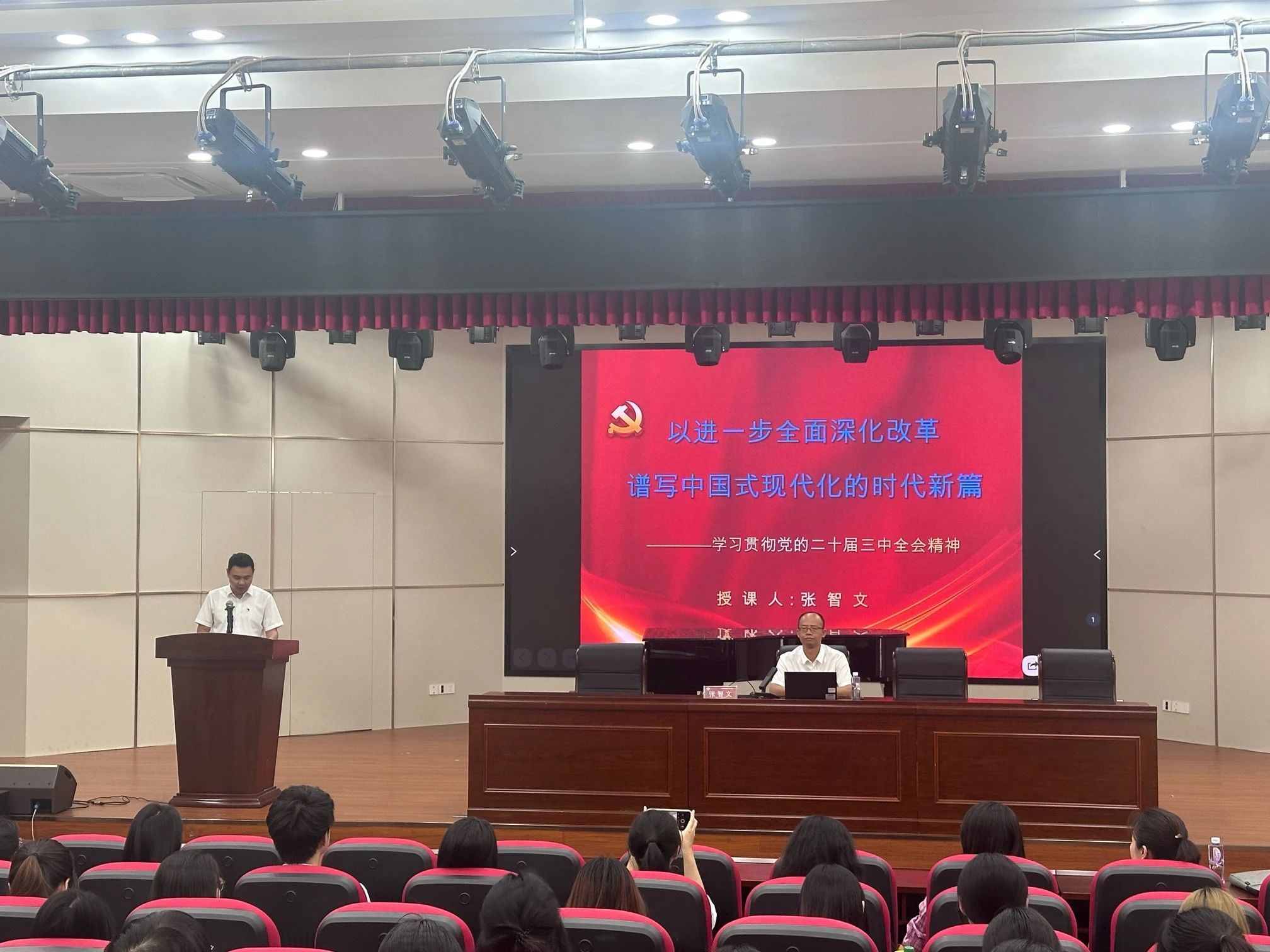第一讲是由漳州市委宣讲团成员,漳州市委党校统战理论教研室主任张智文副教授主讲专题党课《以进一步全面深化改革谱写中国式现代化的时代新篇———学习贯彻党的二十届三中全会精神》。课上,张智文围绕“增强学习动力,全面了解全会基本情况;提高政治站位,深刻认识全会的重大意义;把握精髓要义,深入学习领会习近平总书记在全会上的重要讲话精神;聚焦关键重点,全面准确理解《决定》提出的进一步全面深化改革的重大举措;突出实干实效,全力以赴贯彻落实全会精神”等五个方面,结合当前工作学习情况,对全会精神进行系统讲解和深入阐释。